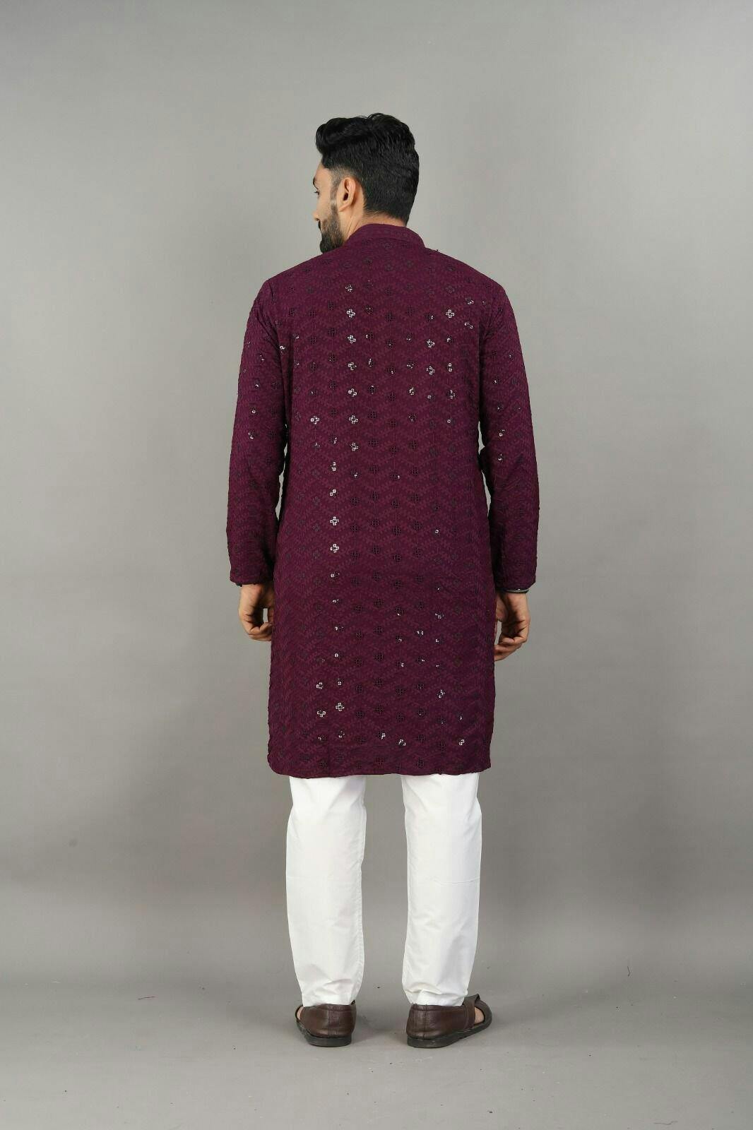 Drape yourself in timeless elegance with the Midnight Royal Kurta. This stunning black embroidered kurta brings a touch of sophistication and charisma to any festive or formal event. The detailed self-work and rich fabric make it a bold yet classy choice for Navratri nights, receptions, sangeet, or evening gatherings. Pair it with white or cream pants to complete the classic monochrome magic.